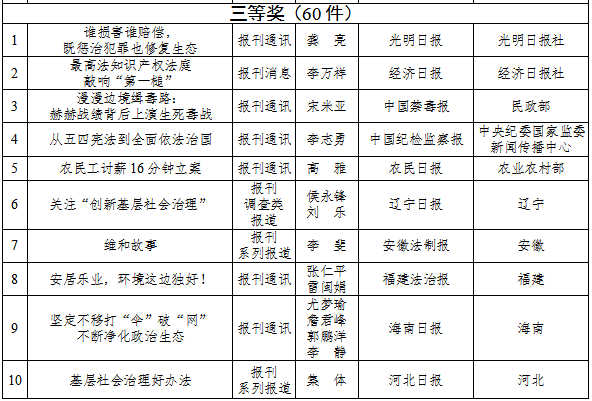 2019年度全国政法优秀新闻作品评选活动已于近日结束。经初评、复评、定评,2019年度共评出获奖作品105篇(件),其中,一等奖15篇(件),二等奖30篇(件),三等奖60篇(件)。