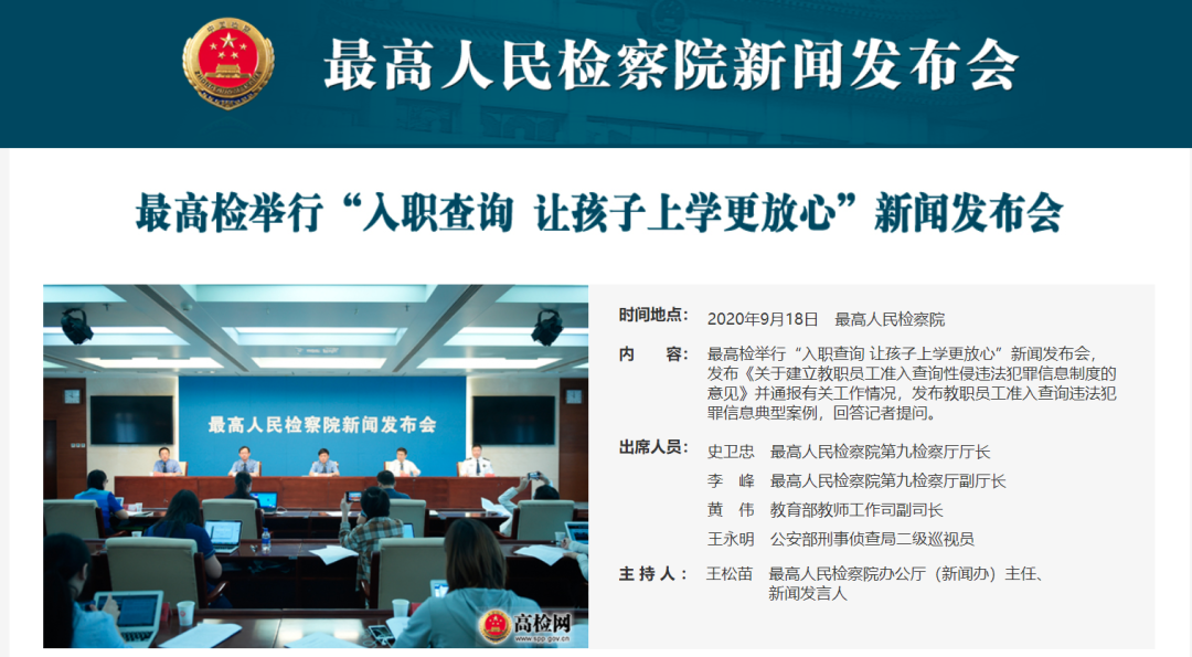 9月18日,最高检举行新闻发布会,发布《关于建立教职员工准入查询性侵违法犯罪信息制度的意见》(以下简称《入职查询意见》)并通报有关工作情况。